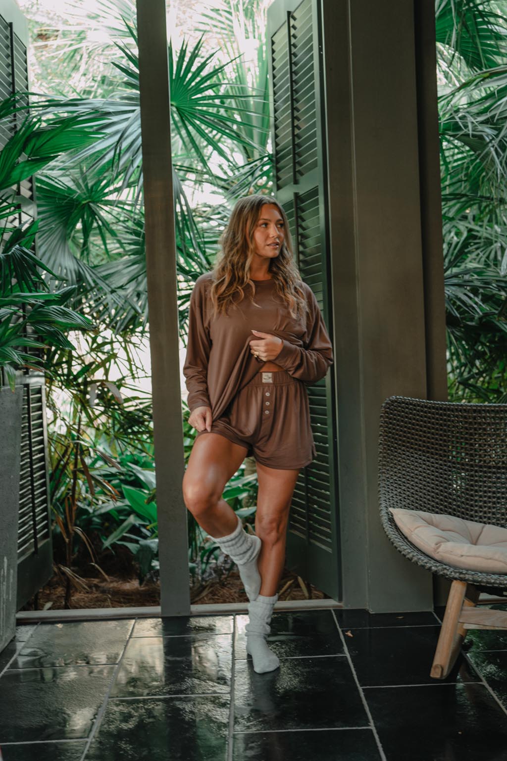 Our Dreamer Long Sleeve Tee is your go-to for effortless comfort, day or night. Made from our breathable, non-toxic dreamer fabric, this full-length, easy-fit tee drapes perfectly for a relaxed yet flattering look. Featuring a script "tribe" embroidery on the pocket, it adds a subtle signature touch to your lounge wardrobe. Soft, airy, and endlessly comfortable, it pairs seamlessly with the Dreamer Boxer Short or Dreamer Wide Leg Pant for the ultimate cozy set. Made in the USA.