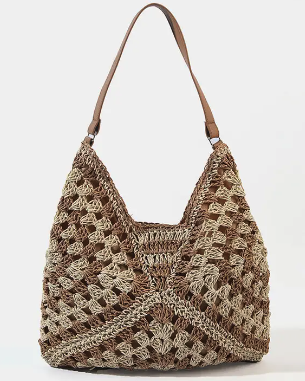 Artisan Craftsmanship: This single-shoulder vacation beach bag showcases an intricate hollow square and large triangle color block weave, offering a unique and stylish look perfect for beach outings or casual summer days.