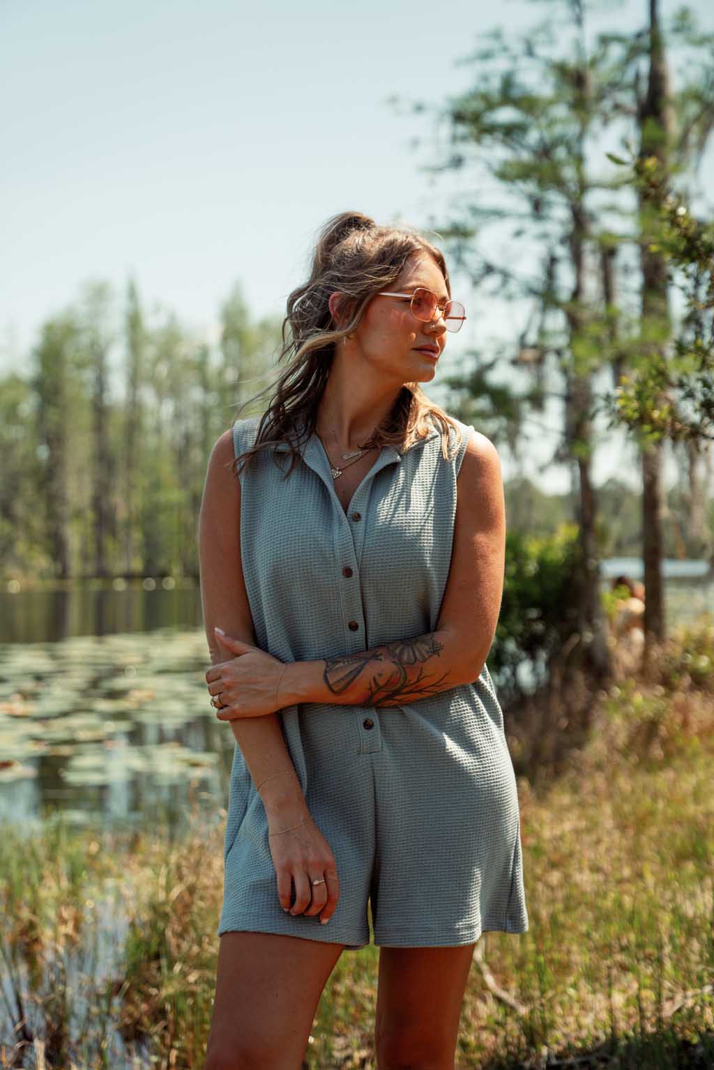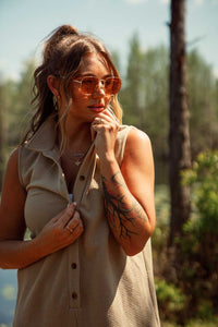 Brittney is 5'7 and wearing a size M romper. (Shown in Oak and Slate Blue)